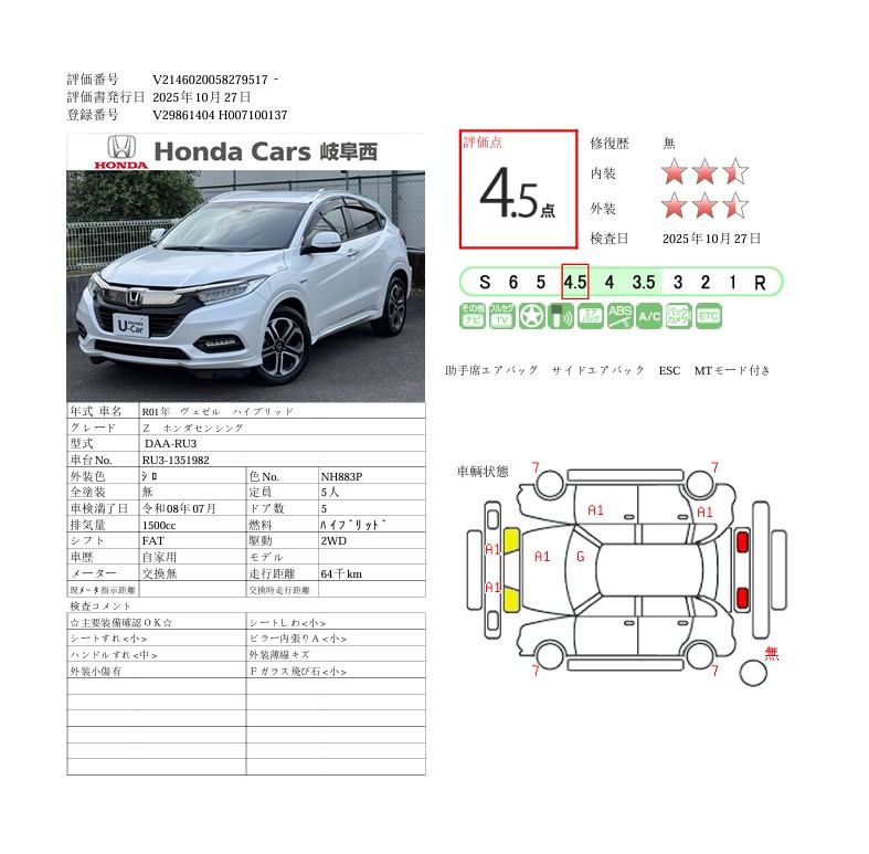 Honda ヴェゼルハイブリッドZ・ホンダセンシング ギャザズナビ VXM-195VFi 前後ドラレコ付き